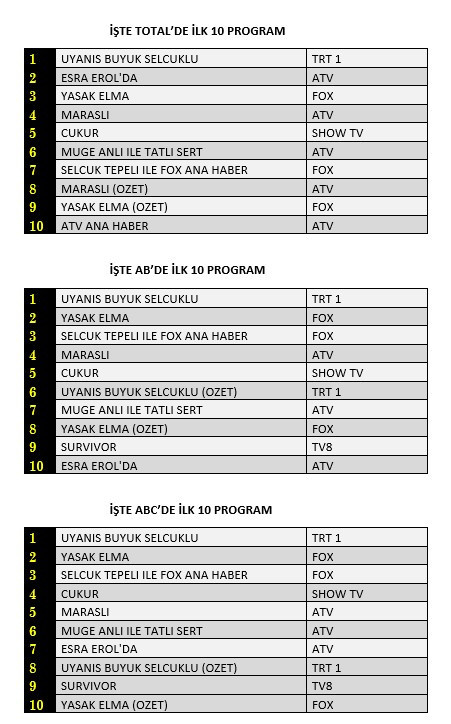 AB'de ise 1. sırada “Uyanış Büyük Selçuklu”, 2. sırada “Yasak Elma”, 3. sırada “Selçuk Tepeli İle Fox Ana Haber” yer aldı.