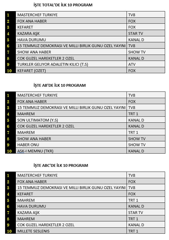 AB'de ise 1. sırada “Masterchef Türkiye”, 2. sırada “Fox Ana Haber”, 3. sırada TV8’de ekrana gelen “15 Temmuz Demokrasi Ve Milli Birlik Günü Özel Yayını” yer aldı.