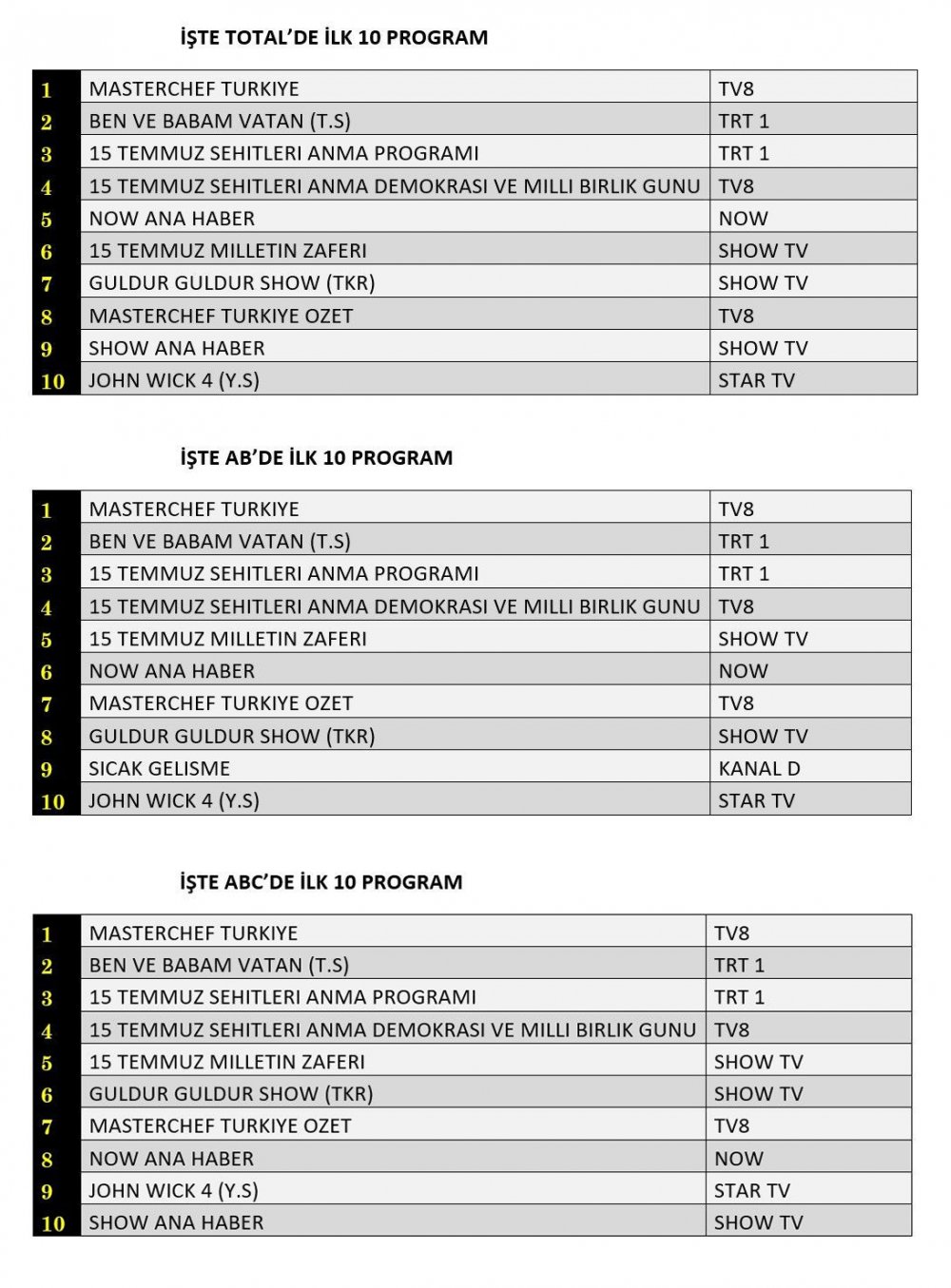 ABC'de ise 1.sırada “Masterchef Türkiye”, 2.sırada “Ben ve Babam Vatan”, 3.sırada “15 Temmuz Şehitleri Anma Programı” yer aldı.