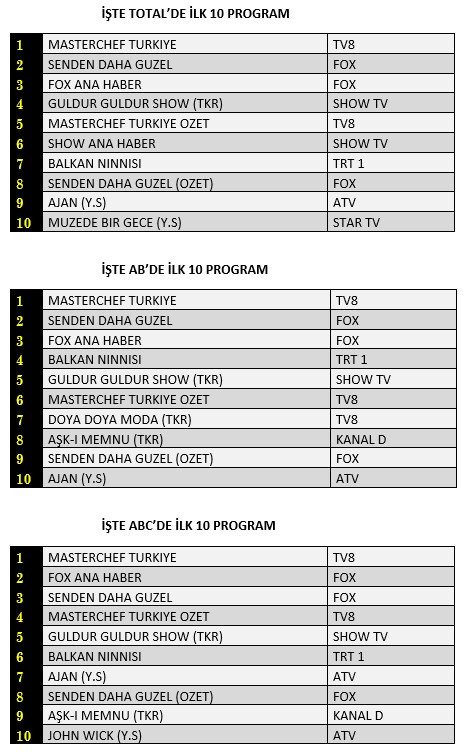 AB'de ise 1. sırada “Masterchef Türkiye”, 2. sırada “Senden Daha Güzel” 3. sırada “Fox Ana Haber” yer aldı.