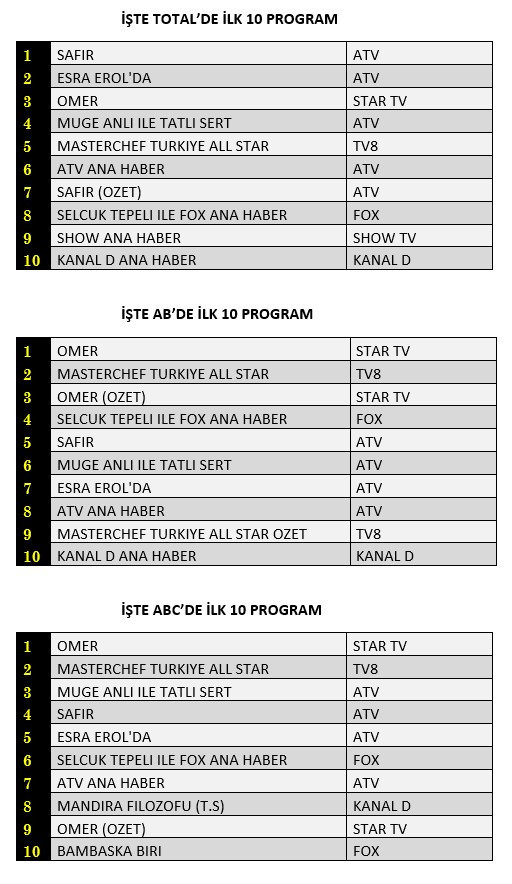 AB'de ise 1.sırada “Ömer”, 2.sırada TV8’de yayınlanan “Masterchef Türkiye All Star”, 3.sırada “Ömer” dizisinin özeti yer aldı.