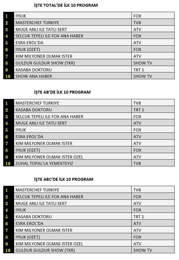 AB'de ise 1.sırada “Masterchef Türkiye”, 2.sırada TRT1’de yayınlanan “Kasaba Doktoru” 3.sırada “Selçuk Tepeli İle Fox Ana Haber” yer aldı.