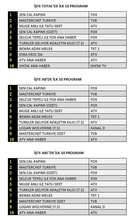 AB'de ise 1. sırada “Sen Çal Kapımı”, 2. sırada “Mastercheff Türkiye”, 3. sırada “Selçuk Tepeli İle Fox Ana Haber” yer aldı.