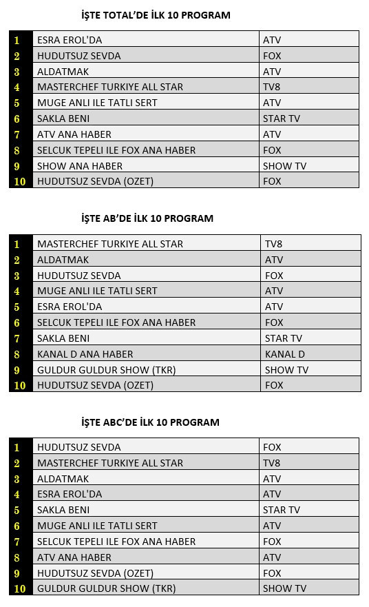AB'de ise 1.sırada TV8’de ekrana gelen “Masterchef Türkiye All Star”, 2.sırada Atv’de yayınlanan “Aldatmak”, 3.sırada “Hudutsuz Sevda” yer aldı.