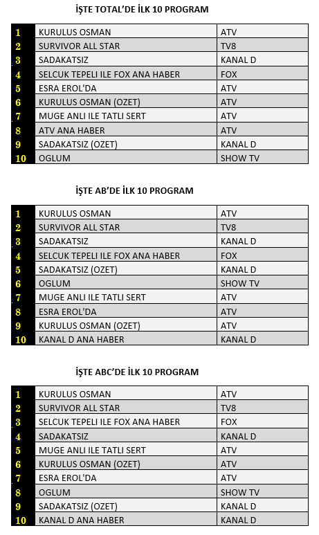AB'de ise 1. sırada “Kuruluş Osman”, 2. sırada “Survivor All Star” 3. sırada “Sadakatsiz” yer aldı.