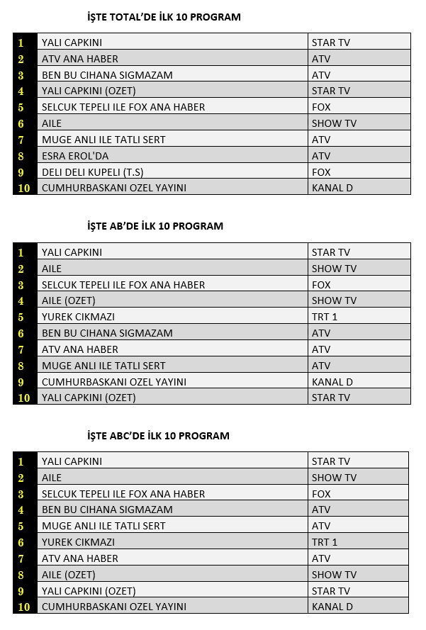 AB'de ise 1. sırada “Yalı Çapkını”, 2.sırada Show TV’de ekrana gelen “Aile”, 3. sırada “Selçuk Tepeli İle Fox Ana Haber” yer aldı.