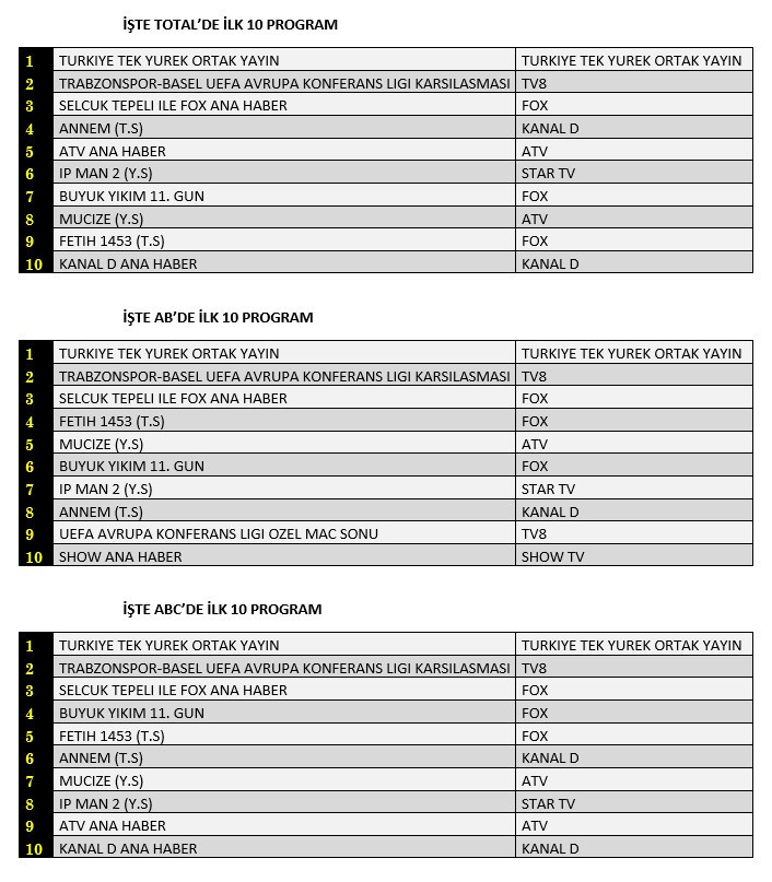 AB'de ise 1.sırada “Türkiye Tek Yürek Ortak Yayın”, 2.sırada “Trabzonspor-Basel UEFA Avrupa Konferans Ligi Karşılaşması”, 3.sırada “Selçuk Tepeli İle Fox Ana Haber” yer aldı.