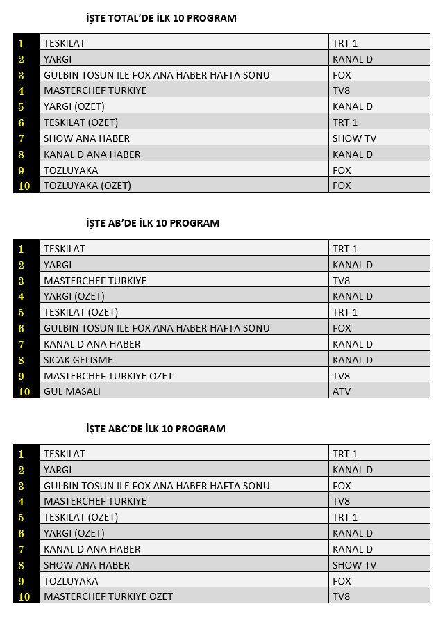 Total'de 1. sırada TRT1’de izleyiciyle buluşan “Teşkilat”, 2. sırada Kanal D’de ekrana gelen “Yargı”, 3. sırada “Gülbin Tosun İle Fox Ana Haber Hafta Sonu” yer aldı.