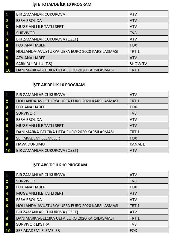 AB'de ise 1. sırada “Bir Zamanlar Çukurova”, 2. sırada TRT1’de yayınlanan “Hollanda-Avusturya UEFA Euro 2020 Karşılaşması”, 3. sırada “Fox Ana Haber” yer aldı.