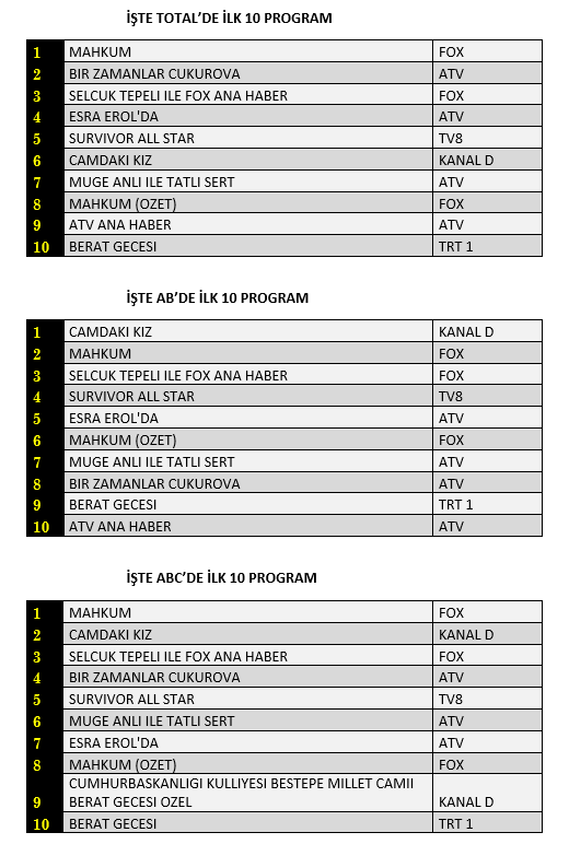 AB'de ise 1. sırada Kanal D’de yayınlanan “Camdaki Kız”, 2. sırada “Mahkum” 3. sırada “Selçuk Tepeli İle Fox Ana Haber” yer aldı.