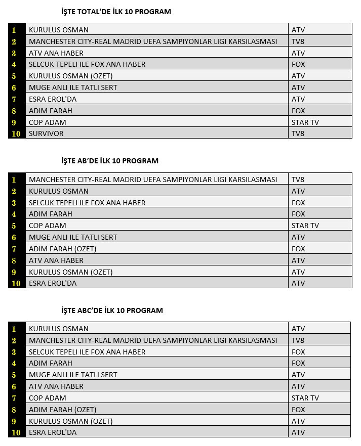 AB'de ise 1. sırada “Manchester City-Real Madrid UEFA Şampiyonlar Ligi Karşılaşması”, 2. sırada “Kuruluş Osman”, 3. sırada “Selçuk Tepeli İle Fox Ana Haber” yer aldı.