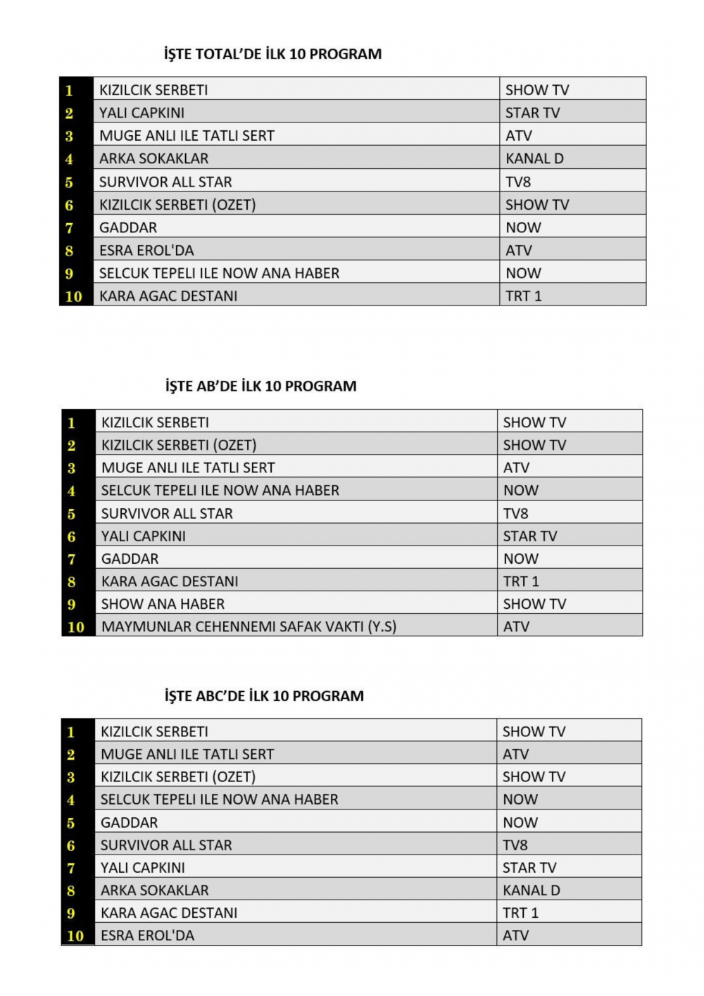 ABC'de ise 1.sırada “Kızılcık Şerbeti”, 2.sırada “Müge Anlı İle Tatlı Sert”, 3.sırada “Kızılcık Şerbeti” dizisinin özeti yer aldı.