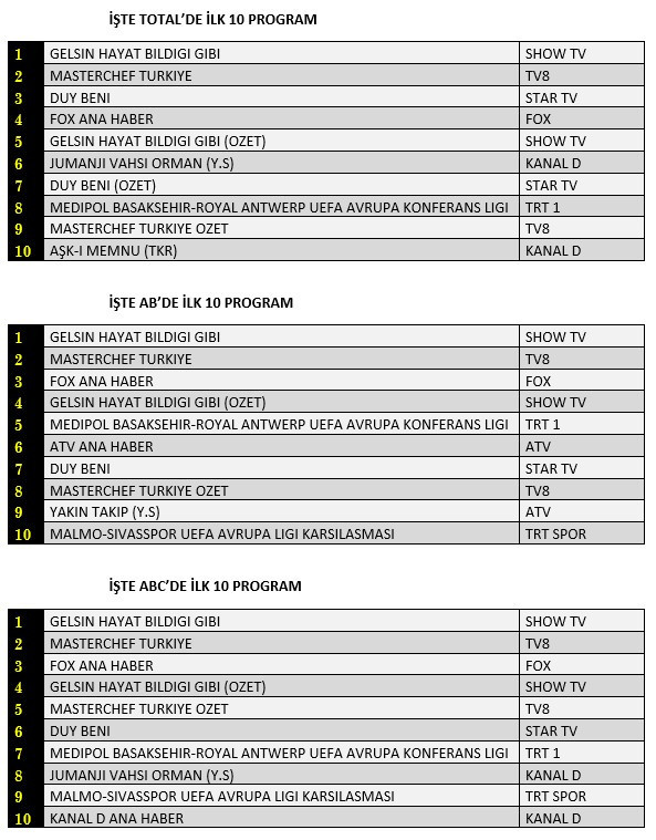 AB'de ise 1. sırada “Gelsin Hayat Bildiği Gibi”, 2. sırada “Masterchef Türkiye” 3. sırada “Fox Ana Haber” yer aldı.
