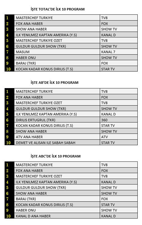 AB'de ise 1. sırada “Mastercheff Türkiye”, 2. sırada “Fox Ana Haber”, 3. sırada “Mastercheff Türkiye”nin özeti yer aldı.