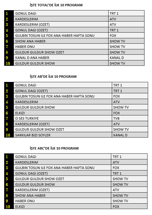Total'de 1.sırada TRT1’de yayınlanan “Gönül Dağı” 2. sırada ATV’de izleyiciyle buluşan “Kardeşlerim”, 3.sırada “Kardeşlerim” dizisinin özeti yer aldı.