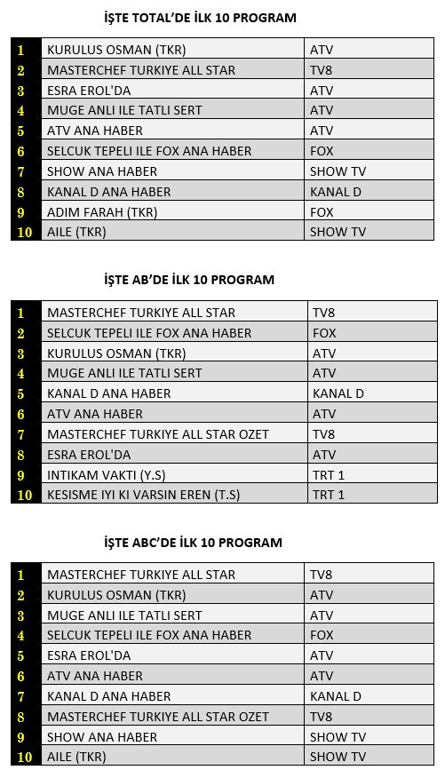 AB'de ise 1. sırada “Masterchef Türkiye All Star”, 2. sırada “Selçuk Tepeli İle Fox Ana Haber”, 3. sırada “Kuruluş Osman” dizisinin tekrarı yer aldı.