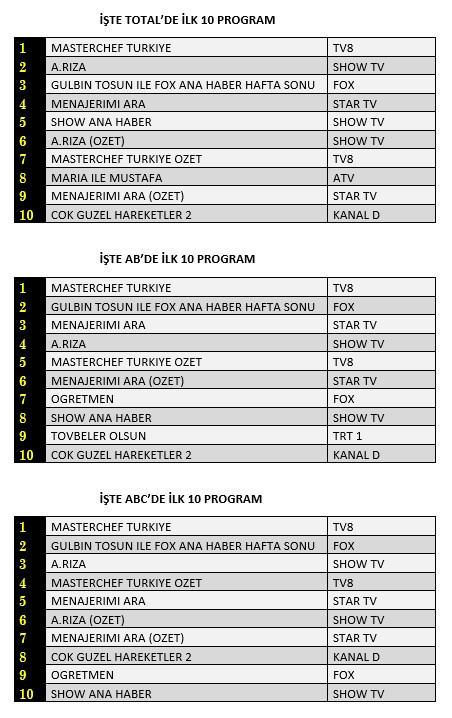 AB'de ise 1. sırada “Masterchef Türkiye”, 2. sırada “Gülbin Tosun İle Fox Ana Haber Hafta Sonu”, 3. sırada Star TV’de yayınlanan “Menajerimi Ara” yer aldı.