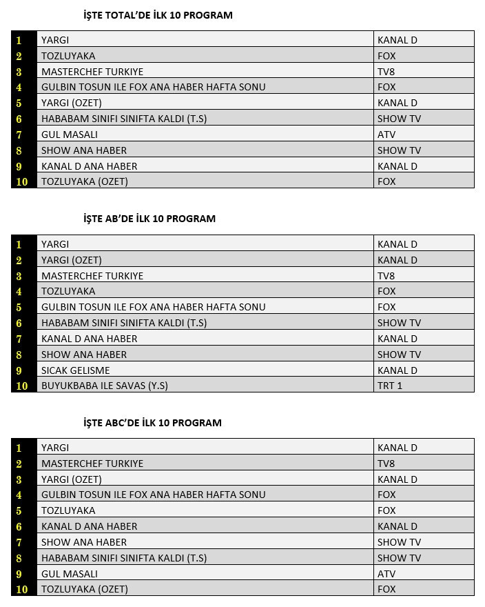 Total'de 1. sırada Kanal D’de yayınlanan “Yargı”, 2. sırada Fox TV’de ekrana gelen “Tozluyaka”, 3. sırada TV8’de izleyiciyle buluşan “Masterchef Türkiye” yer aldı.