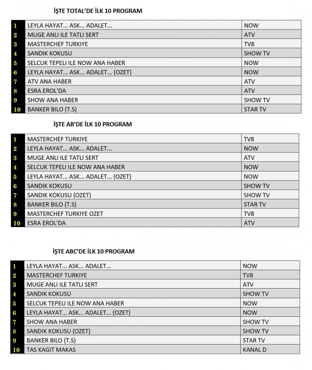 ABC'de ise 1.sırada “Leyla Hayat… Aşk… Adalet…”, 2.sırada “Masterchef Türkiye”, 3.sırada “Müge Anlı İle Tatlı Sert” yer aldı.