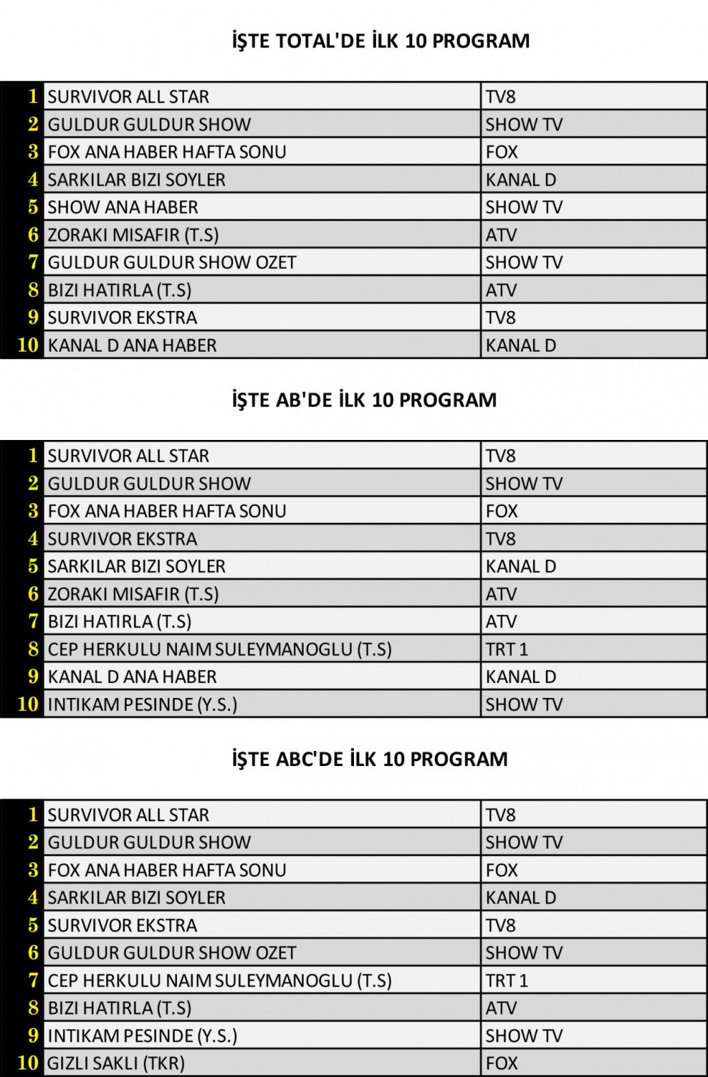 Total’de 1. sırada TV8’de izleyici ile buluşan “Survivor All Star”, 2. Sırada Show TV’de ekranlara gelen “Güldür Güldür Show”, 3. sırada ise “FOX Ana Haber Hafta Sonu” yer aldı.