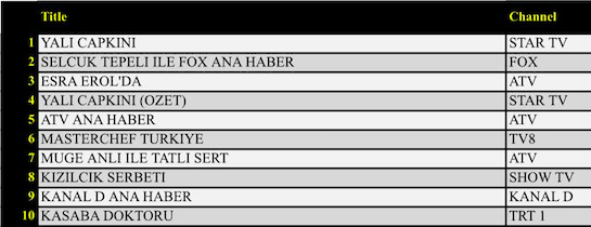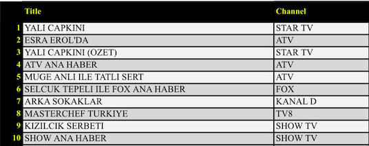 AB'de ilk sıraya "Yalı Çapkını" yerleşirken, ikinci sırada "Yalı Çapkını" dizisnin özeti ve üçüncü sırada "atv Ana Haber" kendine yer buldu.