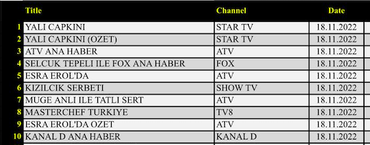 18 Kasım tarihinde; Total'de birinci sırada Star TV'de ekrana gelen "Yalı Çapkını", ikinci sırada atv'de yayınlanan "Esra Erol'da", üçüncü sırada ise "Yalı Çapkını" dizisinin özeti yer aldı.