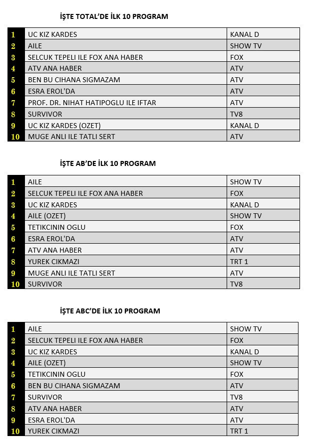 AB'de ise 1.sırada “Aile”, 2.sırada “Selçuk Tepeli İle Fox Ana Haber”, 3.sırada “Üç Kız Kardeş” yer aldı.