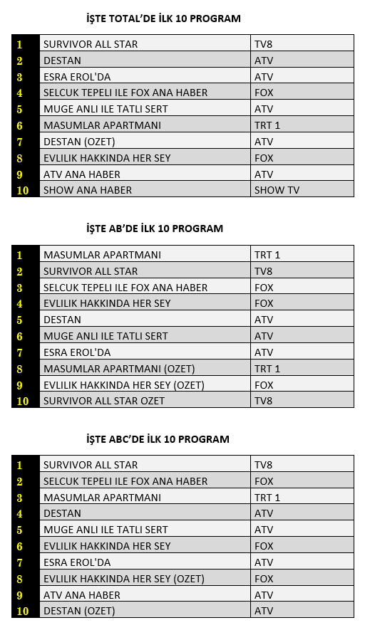 AB'de ise 1. sırada TRT1’de yayınlanan “Masumlar Apartmanı”, 2. sırada “Survivor All Star” 3. sırada “Selçuk Tepeli İle Fox Ana Haber” yer aldı.