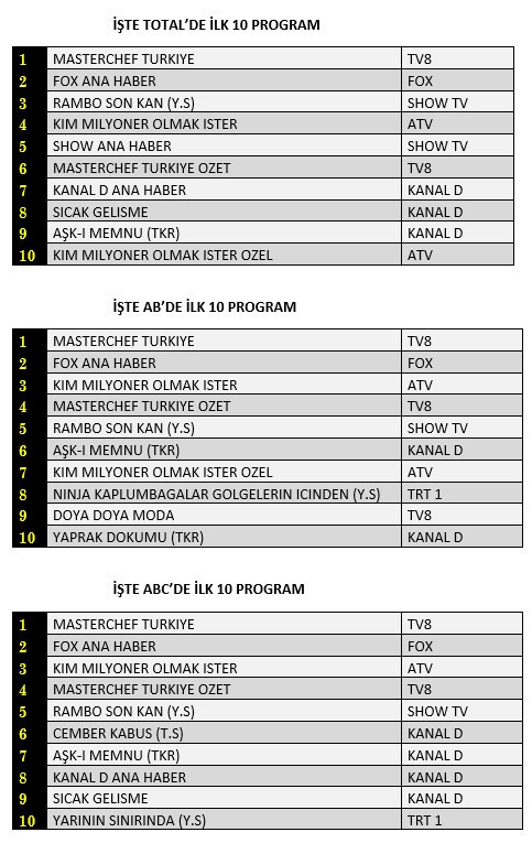AB'de ise 1. sırada “Masterchef Türkiye”, 2. sırada “Fox Ana Haber” 3. sırada ATV’de “Kim Milyoner Olmak İster” yer aldı.