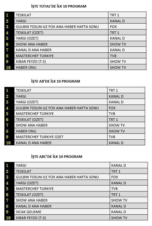 Total'de 1.sırada TRT1’de yayınlanan “Teşkilat” 2. sırada Kanal D’de izleyiciyle buluşan “Yargı”, 3.sırada “Gülbin Tosun İle Fox Ana Haber Hafta Sonu” yer aldı.