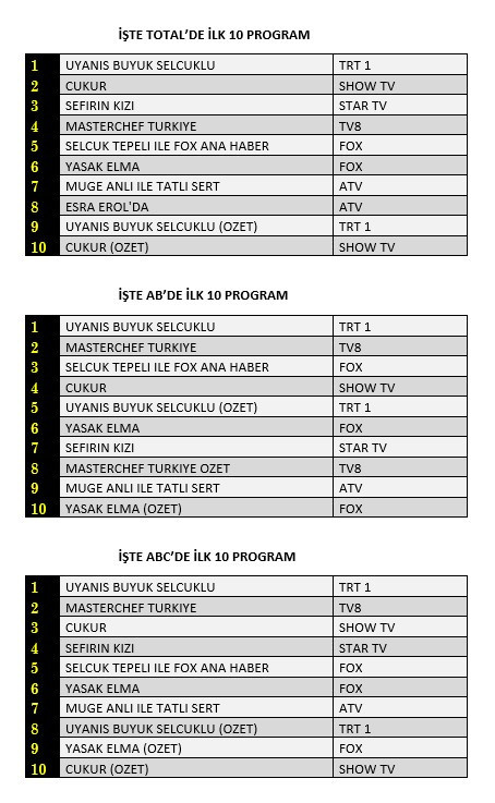 AB'de ise 1. sırada “Uyanış Büyük Selçuklu”, 2. sırada TV8’de yayınlanan “Masterchef Türkiye”, 3. sırada "Selçuk Tepeli İle Fox Ana Haber” yer aldı.