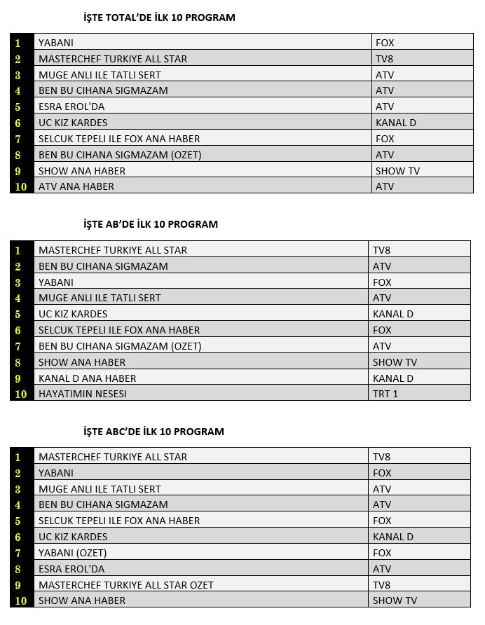 AB'de ise 1.sırada “Masterchef Türkiye All Star”, 2.sırada Atv’de ekrana gelen “Ben Bu Cihana Sığmazam”, 3.sırada “Yabani” yer aldı.