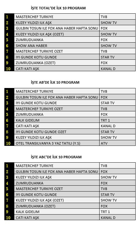 Total'de 1. sırada TV8’de yayınlanan “Mastercheff Türkiye”, 2. sırada Show TV’de ekrana gelen “Kuzey Yıldızı İlk Aşk”, 3. sırada “Gülbin Tosun İle Fox Ana Haber Hafta Sonu” yer aldı.