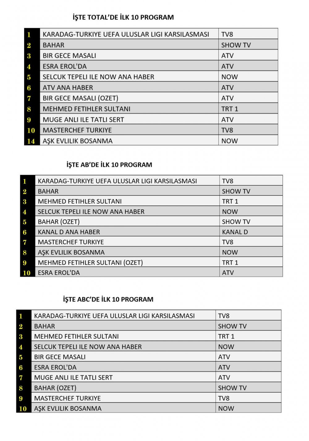 AB ve ABC kategorisinde 1. sırada Karadağ-Türkiye UEFA Uluslar Ligi Karşılaşması, 2. sırada Bahar dizisi, 3 sırada ise TRT 1'de yayınlanan Mehmed Fetihler Sultanı dizisi yer aldı
