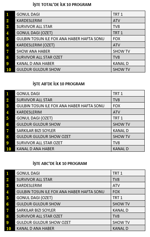 Total'de 1.sırada TRT1’de yayınlanan “Gönül Dağı” 2. sırada ATV’de ekrana gelen “Kardeşlerim”, 3.sırada TV8’de izleyiciyle buluşan “Survivor All Star” yer aldı.