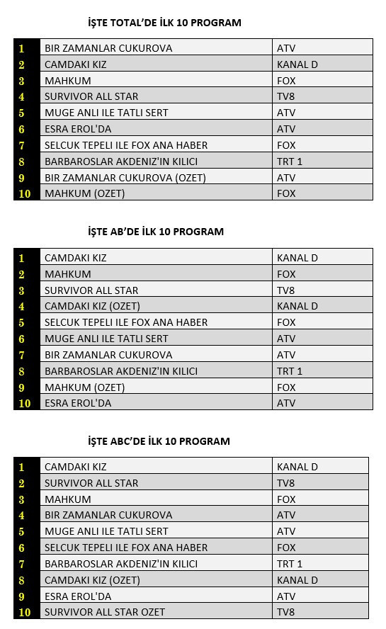 Total'de 1. sırada ATV’de izleyiciyle buluşan “Bir Zamanlar Çukurova”, 2. sırada Kanal D’de ekrana gelen “Camdaki Kız”, 3. sırada Fox TV’de yayınlanan “Mahkum” yer aldı.