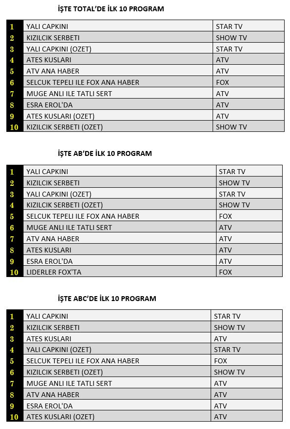 Total'de 1. sırada Star TV’de izleyiciyle buluşan “Yalı Çapkını”, 2. sırada Show TV’de yayınlanan “Kızılcık Şerbeti”, 3. sırada “Yalı Çapkını” dizisinin özeti yer aldı.