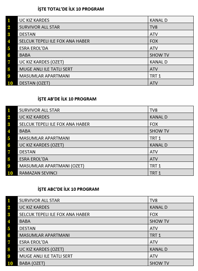Total'de 1. sırada Kanal D’de yayınlanan “Üç Kız Kardeş”, 2. sırada TV8’de ekrana gelen “Survivor All Star”, 3. sırada ATV’de izleyiciyle buluşan “Destan” yer aldı.