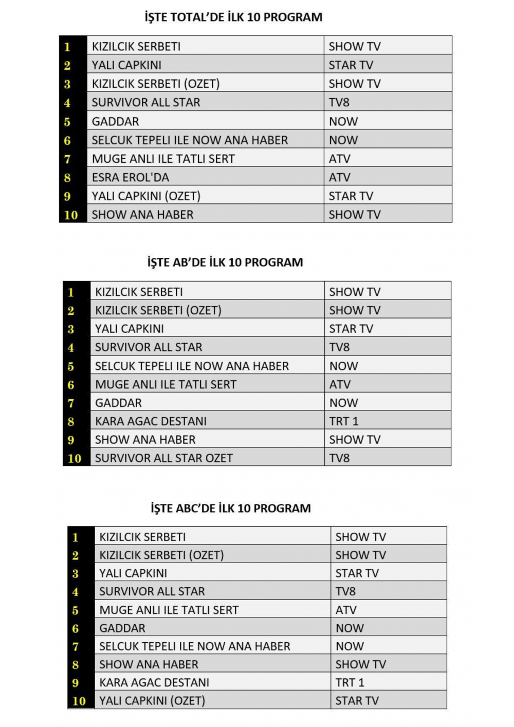 Total'de 1.sırada Show TV’da izleyiciyle buluşan “Kızılcık Şerbeti”, 2. sırada Star TV’de yayınlanan “Yalı Çapkını”, 3.sırada “Kızılcık Şerbeti” dizisinin özeti yer aldı.