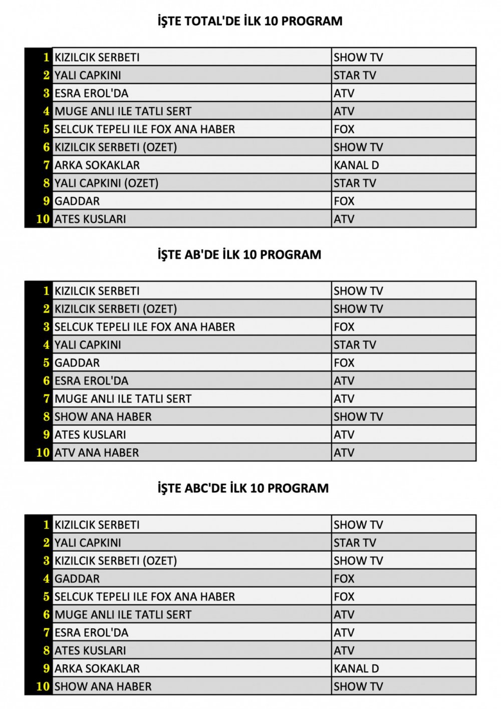 Total’de 1. sırada Show TV’de izleyici ile buluşan “Kızılcık Şerbeti”, 2. sırada Star TV’de ekranlara gelen “Yalı Çapkını”, 3. sırada ise atv’de yayınlanan “Esra Erol’da”programı yer aldı.