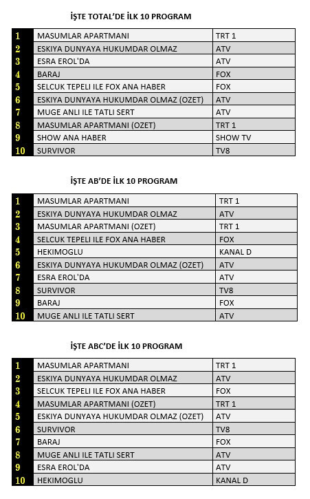 Total'de 1. sırada TRT1’de ekrana gelen “Masumlar Apartmanı”, 2. sırada Atv’de yayınlanan “Eşkıya Dünyaya Hükümdar Olmaz”, 3. sırada atv’de izleyiciyle buluşan “Esra Erol’da” programı yer aldı.
