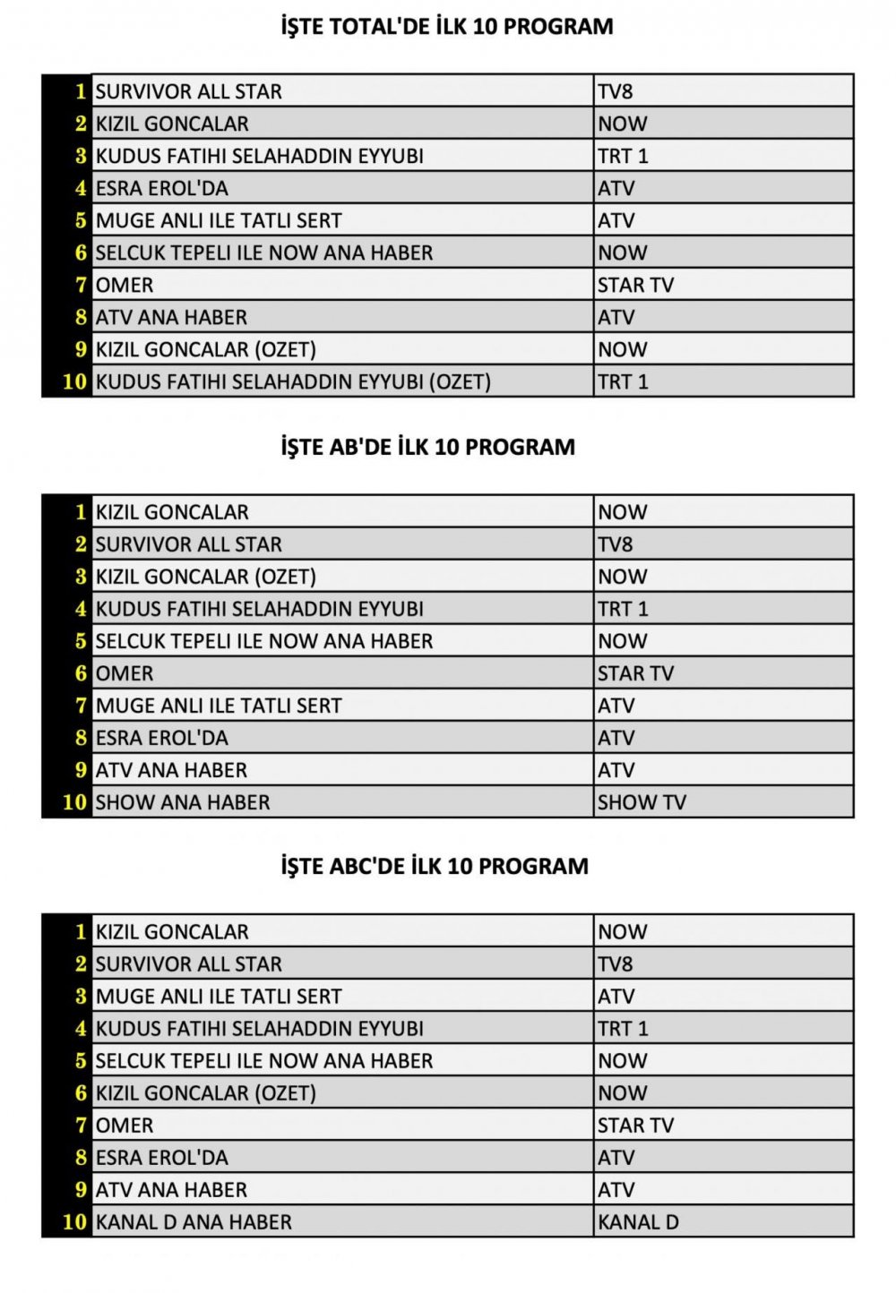 ABC’de 1. sırada “Kızıl Goncalar”,2. sırada “Survivor All Star”, 3. sırada ise “Müge Anlı ile Tatlı Sert” yer aldı.