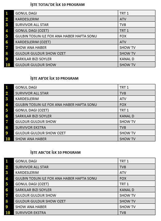 AB'de ise 1.sırada “Gönül Dağı”, 2.sırada “Survivor All Star” 3.sırada “Kardeşlerim” yer aldı.