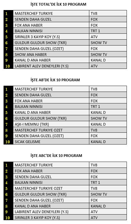 AB'de ise 1. sırada “Masterchef Türkiye”, 2. sırada “Senden Daha Güzel” 3. sırada “Fox Ana Haber” yer aldı.