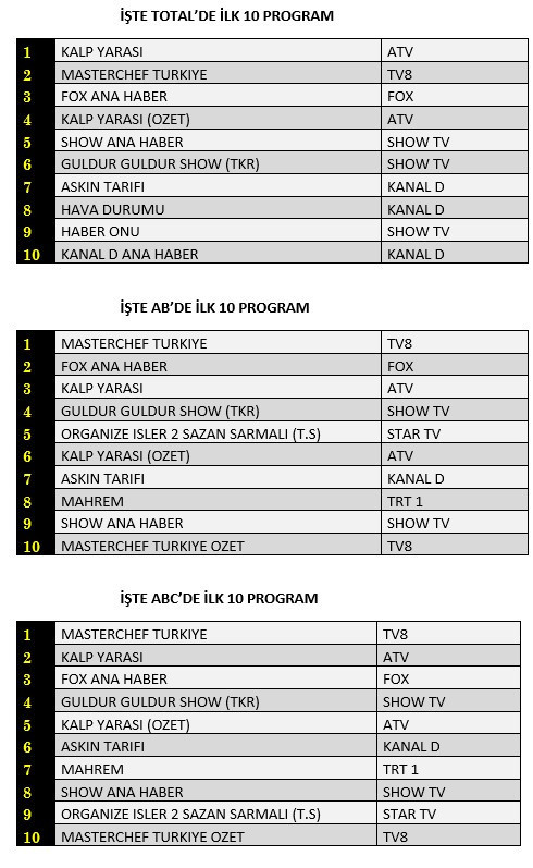 AB'de ise 1. sırada “Masterchef Türkiye”, 2. sırada “Fox Ana Haber” 3. sırada “Kalp Yarası” yer aldı.