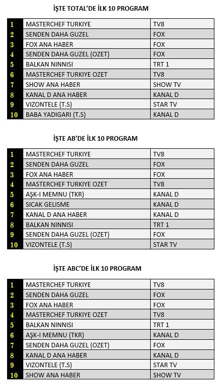 AB'de ise 1. sırada “Masterchef Türkiye”, 2. sırada “Senden Daha Güzel” 3. sırada “Fox Ana Haber” yer aldı.