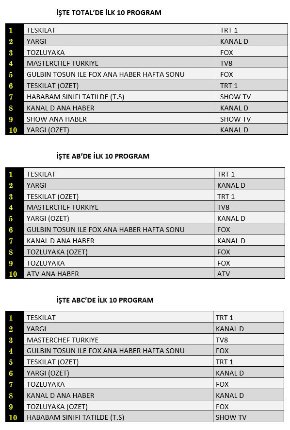 Total'de 1. sırada TRT1’de izleyiciyle buluşan “Teşkilat”, 2. sırada Kanal D’de ekrana gelen “Yargı”, 3. sırada Fox TV’de yayınlanan “Tozluyaka” yer aldı.