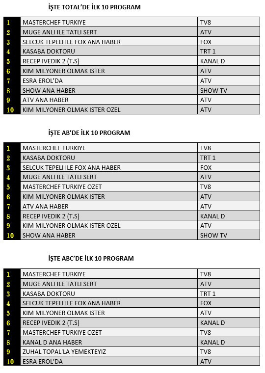 AB'de ise 1. sırada “Masterchef Türkiye”, 2. sırada TRT1’de yayınlanan “Kasaba Doktoru” 3. sırada “Selçuk Tepeli İle Fox Ana Haber” yer aldı.
