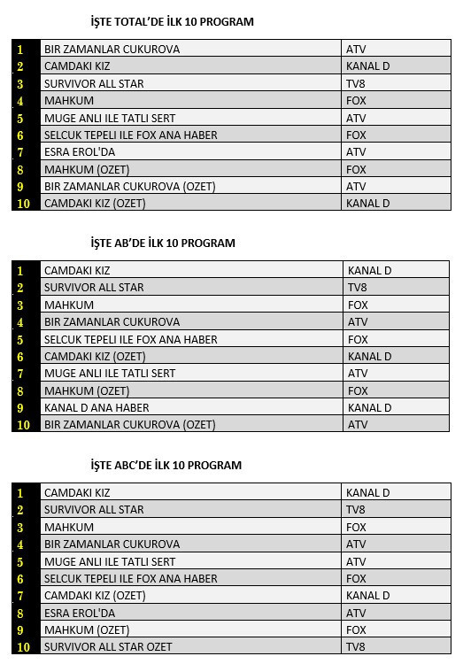 Total'de 1. sırada ATV’de izleyiciyle buluşan “Bir Zamanlar Çukurova”, 2. sırada Kanal D’de ekrana gelen “Camdaki Kız”, 3. sırada TV8’de yayınlanan “Survivor All Star” yer aldı.