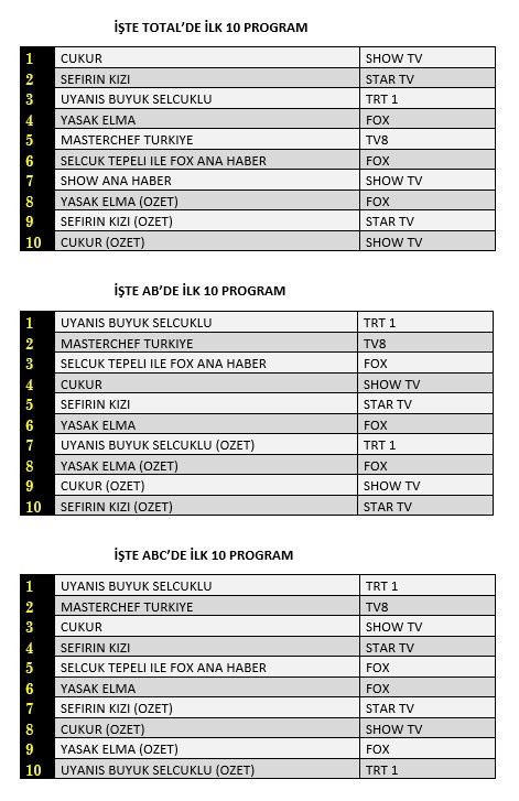 Total'de 1. sırada Show TV’de yayınlanan “Çukur”, 2. sırada Star TV’de ekrana gelen “Sefirin Kızı”, 3. sırada TRT1’de izleyici ile buluşan “Uyanış Büyük Selçuklu” yer aldı.